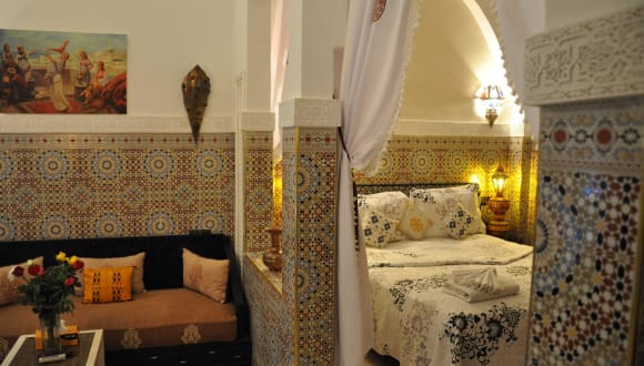 Im Riad L'Arabesque können Sie sich in der marokkanischen Lounge mit einem TV entspannen oder auf der Terrasse verweilen.