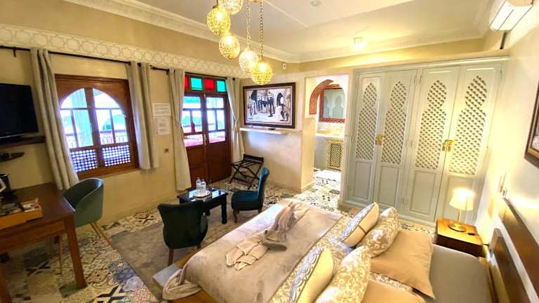 Die Zimmer im Riad besitzen eine Terrasse mit Blick auf den Pool und verfügen über ein eigenes Bad mit Dusche, kostenfreien Pflegeprodukten und einem Haartrockner. Zusätzlich sind die Unterkünfte mit einem Flachbild-Sat-TV ausgestattet.