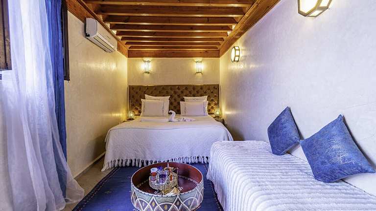 Die klimatisierten Zimmer und Suiten zeichnen sich durch eine eigene Terrasse und eine traditionelle marokkanische Einrichtung aus. Die Suiten sind zusätzlich mit einer Whirlpool-Badewanne ausgestattet. Des Weiteren steht eine Gemeinschaftslounge mit einem Fernseher zur Verfügung.