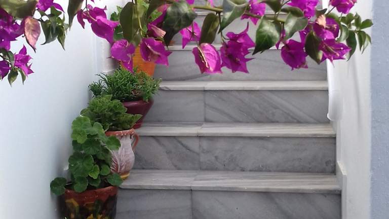 Ricos Two Bedroom House - Naoussa Paros bietet eine klimatisierte Ferienwohnung mit einem Garten. Die Unterkunft zeichnet sich durch ein heimeliges Ambiente aus und umfasst zwei Schlafzimmer, ein Badezimmer, einen Essbereich sowie eine voll ausgestattete Küche. Die Terrasse bietet einen schönen Stadtblick. Ein Privatparkplatz ist vorhanden, und Gäste profitieren von kostenlosem WLAN.