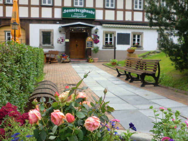 Das Wanderhotel Sonnebergbaude Waltersdorf ... ... liegt am Fuße der Lausche, dem höchsten Berg im Zittauer Gebirge. Wir befinden uns in einer Höhenlage von 500 m. Genießen Sie den herrlichen Blick auf die Waltersdorfer Berge. Hier liegt das Paradies für Genießer der Natur, denn Wanderwege wie der Oberlausitzer Bergweg führen direkt am Hotel vorbei. Unser Team hält kompetente Tipps für Sie bereit. Wir bieten Ihnen auch die unmittelbare Nähe zu Radstrecken wie den Umgebindehausradweg. Zahlreiche Mountainbikestrecken können wir Ihnen empfehlen. Ausstattung unseres Hauses Wir bieten Ihnen 47 Betten in 14 Doppel- bzw. Zweibettzimmern, zwei Appartements für 4 Personen und ein Appartement für 3 Personen mit jeweils zwei getrennten Schlafzimmern und einem gemeinsamen Bad sowie 5 Einzelzimmer für unsere Radfahrer, Biker oder Skifahrer gibt es einen abschließbaren beheizten Raum mit Schrauber- bzw. Skipräparationsecke im Außenbereich neben dem Hauseingang finden Sie unsere Schuhputzecke für besonders verschmutzte Wanderschuhe... Trockenraum im Hotelbereich im Restaurant bieten wir saisonal - frische Küche und ein umfangreiches Weinangebot