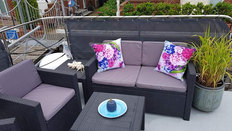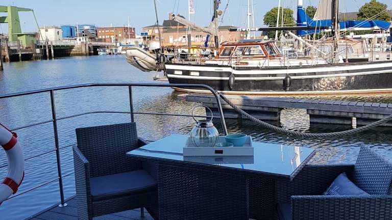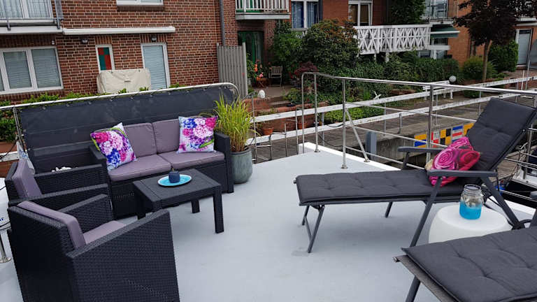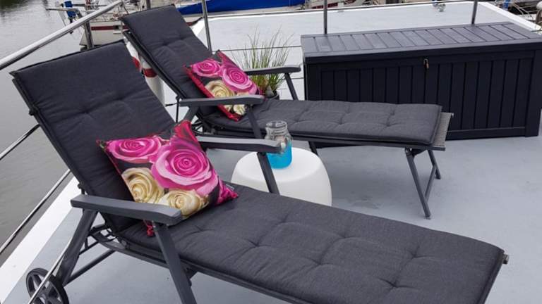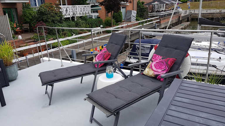 Das Boot verfügt über ein Schlafzimmer, ein Wohnzimmer und eine gut ausgestattete Küche mit Kühlschrank und Geschirrspüler. Zur Ausstattung gehören auch eine Veranda / Patio, eine Kaffeemaschine sowie ein Flachbild-TV. Im Badezimmer befindet sich eine Dusche. Handtücher und Bettwäsche werden bereitgestellt.