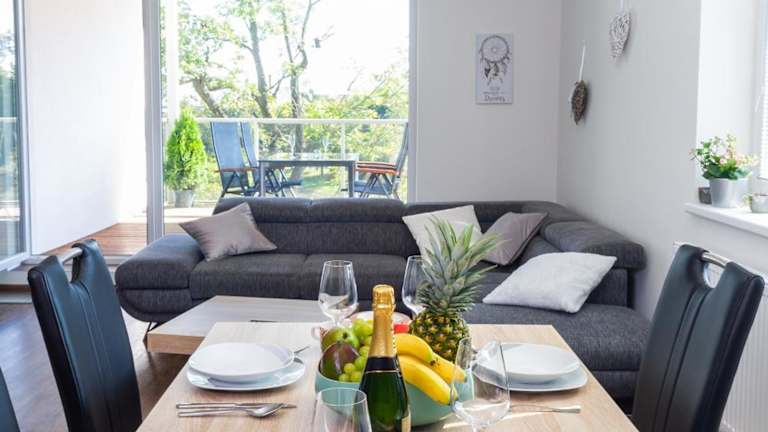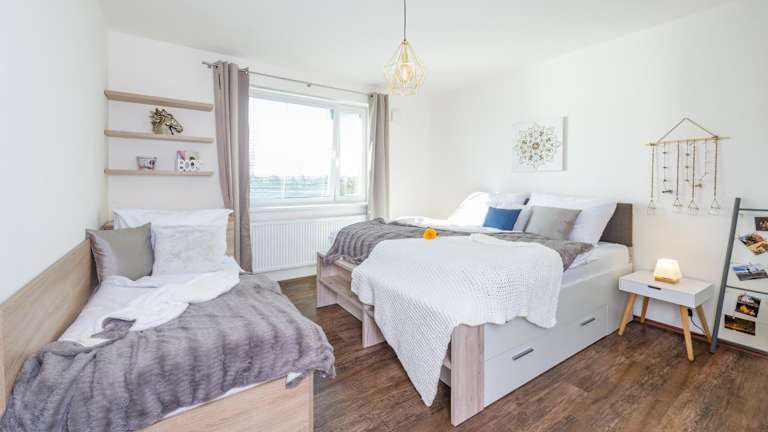 Die Ferienwohnung umfasst 2 heimelige Schlafzimmer sowie ein Badezimmer mit Dusche und Badewanne. Zudem steht eine gut ausgestattete Küche mit Kühlschrank, Geschirrspüler und Ofen zur Verfügung. Das Wohnzimmer bietet einen Sitzbereich und einen Essbereich sowie einen Blu-ray-Player. Handtücher und Bettwäsche sind ebenfalls vorhanden.