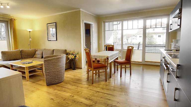 Die Ferienwohnung umfasst zwei Schlafzimmer, ein Wohnzimmer und eine gut ausgestattete Küchenzeile. Ein Balkon steht ebenfalls zur Verfügung.