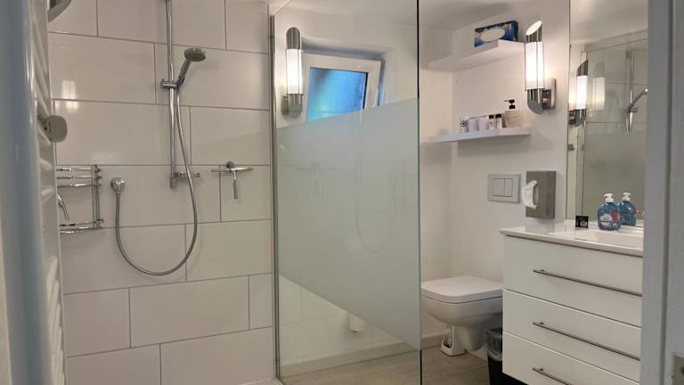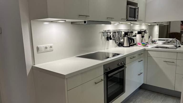 Die Ferienwohnung im Erdgeschoss umfasst 2 Schlafzimmer, eine gut ausgestattete Küche mit Kühlschrank und Geschirrspüler sowie ein Wohnzimmer mit TV.
