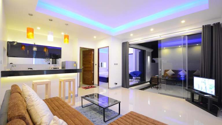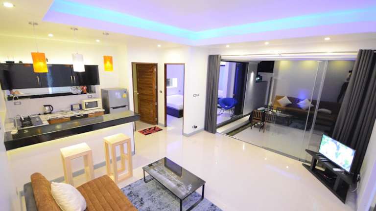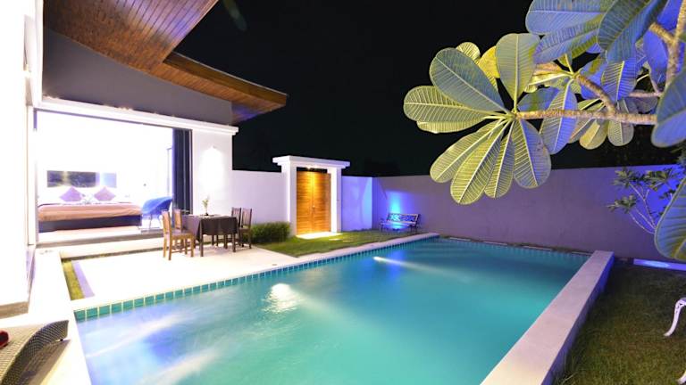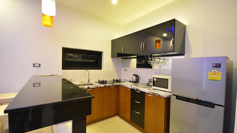 Die Wohneinheiten der Rocking Chair Pool Villa sind modern und gut ausgestattet. Jede Einheit verfügt über einen Sitzbereich, einen Satelliten-Flachbild-TV sowie eine voll ausgestattete Küche mit Kühlschrank und Mikrowelle. Es steht ein eigenes Badezimmer mit Dusche und kostenlosen Pflegeprodukten zur Verfügung. Auf Anfrage können Handtücher und Bettwäsche gegen Aufpreis bereitgestellt werden.