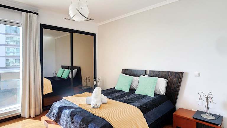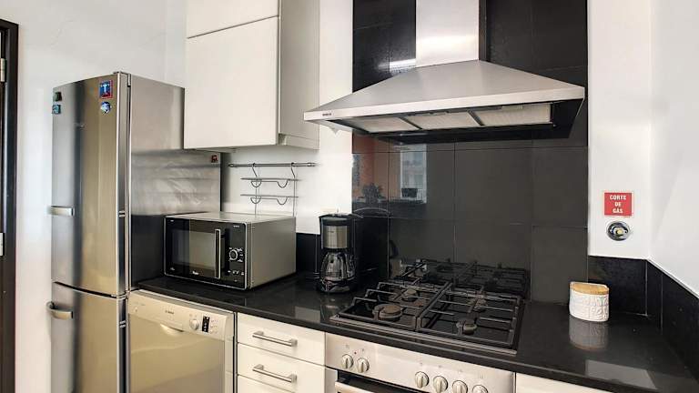 Die Ferienwohnung verfügt über ein Schlafzimmer und ist mit einem TV sowie einer voll ausgestatteten Küchenzeile ausgestattet. Diese beinhaltet einen Geschirrspüler, einen Ofen, eine Waschmaschine, eine Mikrowelle und einen Toaster.