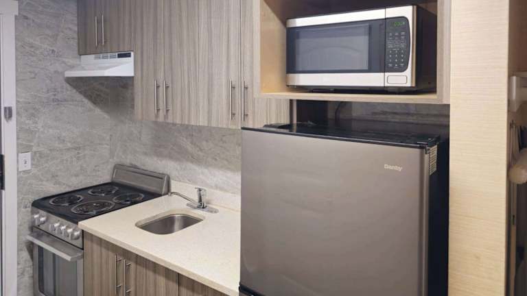 Die Zimmer sind klimatisiert und verfügen über eine Heizung sowie einen Balkon in den meisten Unterkünften. Sie sind mit einem Queensizebett und einem Sofabett ausgestattet. Eine Kochnische mit Kühlschrank und Tee-/Kaffeekocher ist ebenfalls vorhanden. Zudem bieten die Zimmer einen Telefon, Sat-TV, Radio und kostenfreies Wifi. Familien-, Nichtraucher- und Raucherzimmer sind buchbar.
