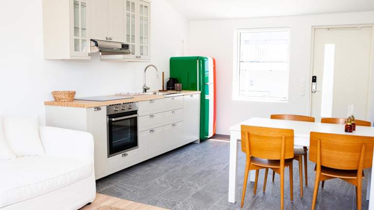 Die Unterkunft verfügt über eine voll ausgestattete Küche, in der sich unter anderem ein Kühlschrank, Geschirrspüler, Mikrowelle sowie ein Wasserkocher befinden. Grillmöglichkeiten sind ebenfalls vorhanden.