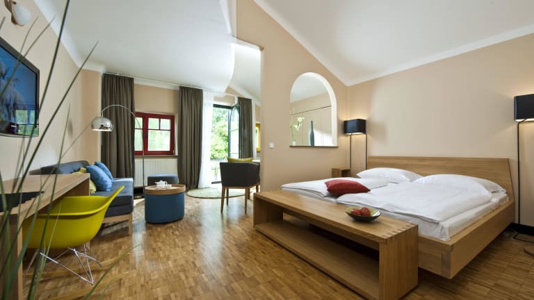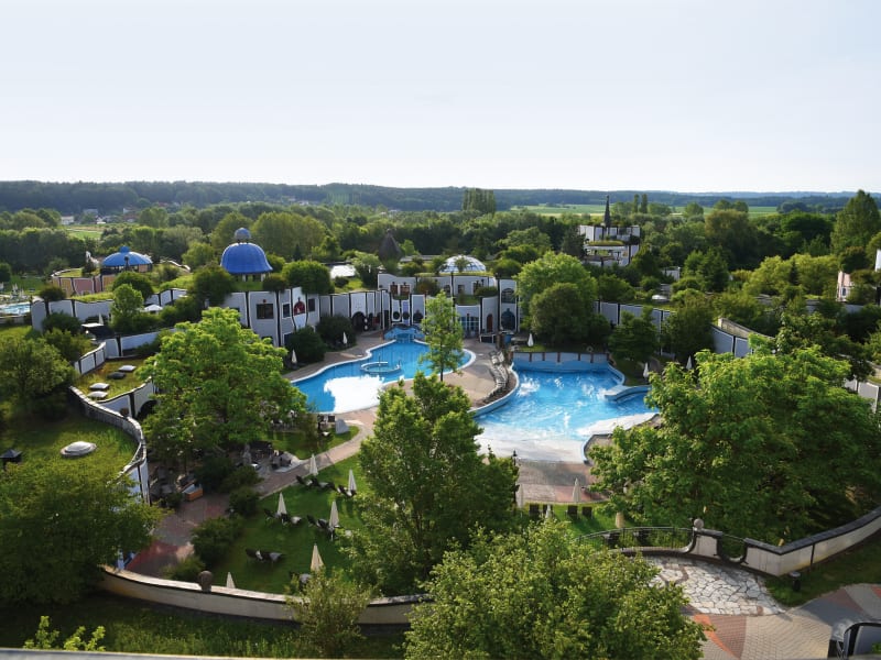 Bewachsene Dächer, runde Formen, bunte Fassaden und goldene Kuppeln fügen sich zu einem lebenden Gesamtkunstwerk. Kaum ein Künstler verbreitet mit einen Werken so gute Laune wie Friedensreich Hundertwasser in seinem verwirklichten Traum vom Leben im Einklang mit der Natur. Angelegt wie ein Ort, der sich von der Mitte hin in die offene Landschaft verzweigt mit verschiedensten Wohn-, Bade- und Restaurantbereichen. Im Mittelpunkt steht das Wasser mit 14 unterschiedlichen Innen- und Außenbecken und zwei Thermalquellen. Allen voran die heiße Vulkania® Heilquelle. Ein Binnenmeer aus rund 3.000 Metern Tiefe, hochmineralisiert mit natürlichem Solegehalt. SPA Unzählige Refugien am und im Wasser laden hier zum Träumen und Kuscheln ein. Wohltuende Massagen mit duftenden Blütenessenzen und selbst angesetzten biologischen Vollsonnenölauszügen verwöhnen und berühren im mehrfach ausgezeichneten Spa. KULINARIUM Für Gaumenfreuden sorgen unterschiedliche Restaurants. Gekocht wird vorwiegend mit Lebensmitteln aus der Region. Einen besonderen Abend erleben Sie im Gourmet Restaurant - im Sommer auch auf der romantischen Seerosenteichterrasse. NATURURLAUB Erleben Sie auch in den Augenschlitzhäusern - den kleinen Appartements - die Architektur und die Natur ganz nah. Fast privat. Gerne auch mit Hund. Im Sportbecken seine 100 m Zeit testen oder eine Wanderung zur 1000jährigen Eiche. Bewegung kann so vielfältig sein. Im Rogner Bad Blumau findet jeder für sich das Richtige.