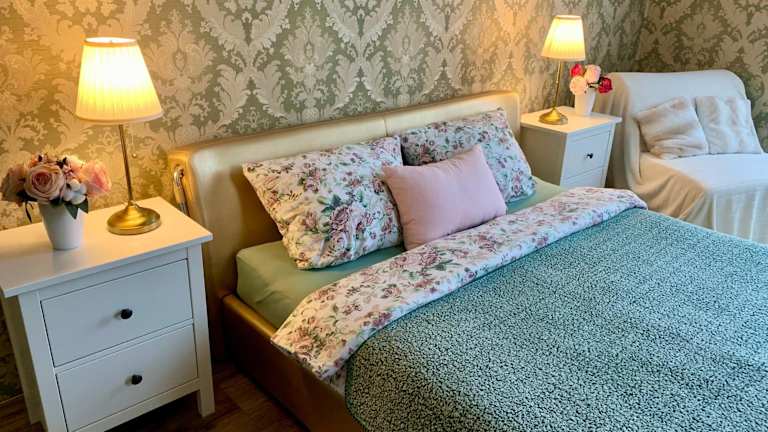 Die Ferienwohnung umfasst ein Schlafzimmer und ein Badezimmer, ausgestattet mit Bettwäsche und Handtüchern. Ein Flachbild-TV ist ebenfalls vorhanden.