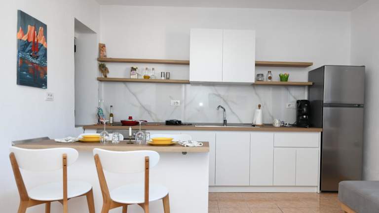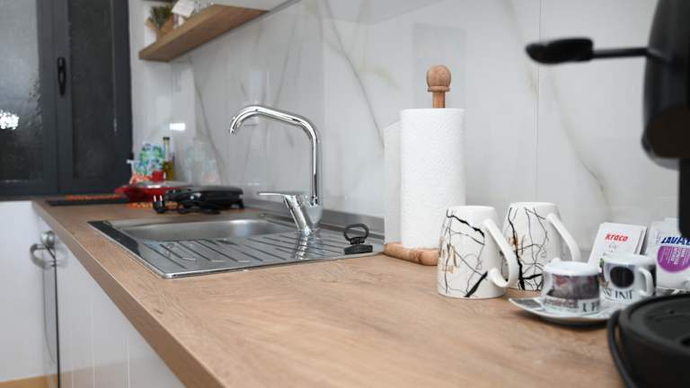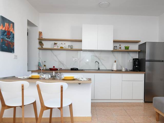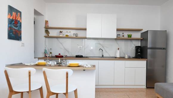 Die Ferienwohnung besteht aus einem Schlafzimmer, einem Wohnzimmer sowie einer voll ausgestatteten Küche, die mit einem Kühlschrank und einer Kaffeemaschine ausgestattet ist. Des Weiteren stehen ein Badezimmer mit Bidet und Dusche zur Verfügung. In der Unterkunft werden Handtücher und Bettwäsche bereitgestellt.
