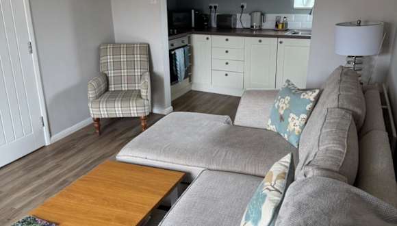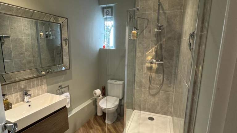 In dieser Ferienwohnung werden Handtücher und Bettwäsche zur Verfügung gestellt. Die Ausstattung umfasst ein Schlafzimmer, ein gemütliches Wohnzimmer, einen Essbereich und ein Badezimmer mit Dusche.
