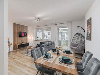 Die Ferienwohnung besteht aus einem Schlafzimmer, einem Wohnzimmer sowie einer voll ausgestatteten Küche, die unter anderem mit einem Kühlschrank und einer Kaffeemaschine ausgestattet ist. Ein Badezimmer mit Dusche und kostenlosen Pflegeprodukten ist ebenfalls vorhanden. Handtücher und Bettwäsche werden bereitgestellt.