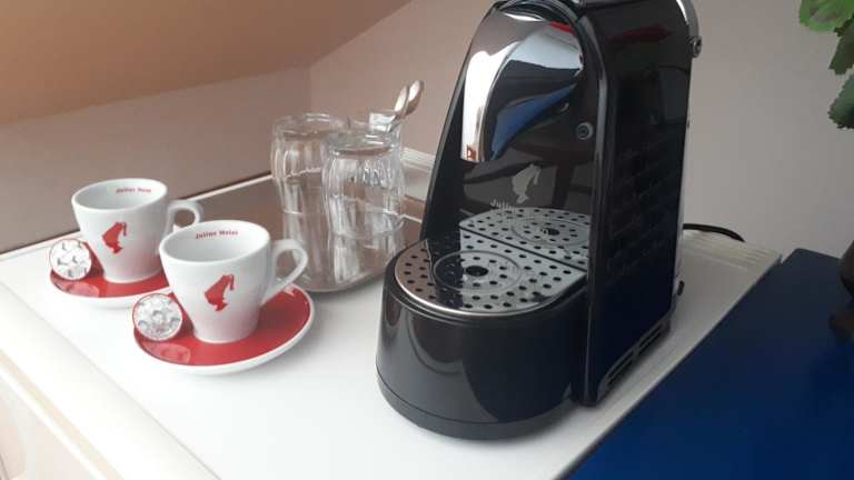 Die Ferienwohnung bietet eine voll ausgestattete Küche mit Kühlschrank und Wasserkocher. Zudem ist die Essenslieferung in die Unterkunft möglich.