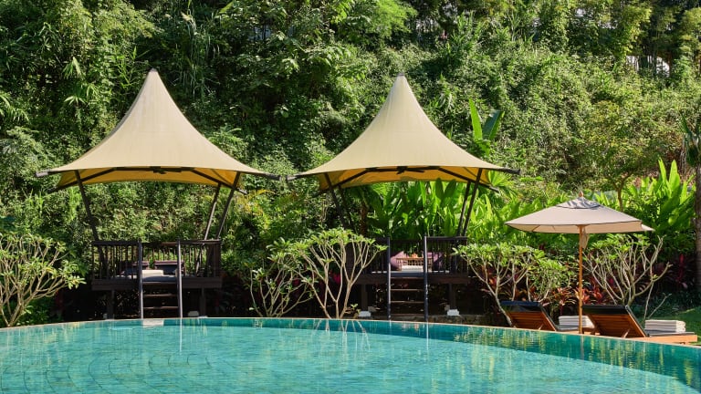 Die Zimmer sind Nichtraucherzimmer und bieten eine Vielzahl an Annehmlichkeiten, darunter Klimaanlage, Safe, Kühlschrank, Minibar und kostenfreies Wifi. Die Aufteilung variiert je nach Zimmertyp, mit Optionen wie kombiniertem Wohn-/Schlafzimmer, Fluss- oder Gartenblick sowie Zugang zu privaten Terrassen oder Plunge Pools.