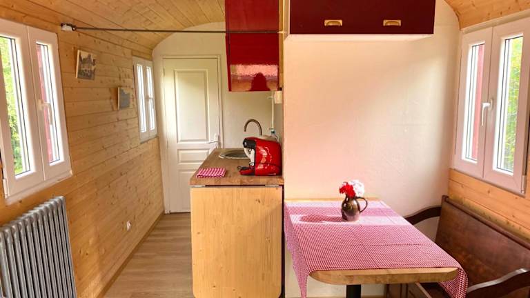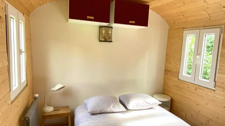 Die Roulotte umfasst 1 Schlafzimmer sowie ein Wohnzimmer. Eine gut ausgestattete Küchenzeile mit Kühlschrank und Herdplatte steht zur Verfügung. Handtücher und Bettwäsche werden zur Verfügung gestellt. Die Unterkunft bietet auch Nichtraucherzimmer.