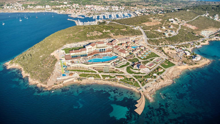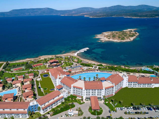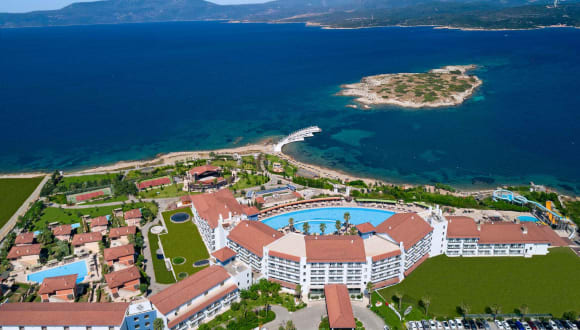 Nur etwa 30km südwestlich von Izmir finden Sie die malerische Hafenstadt Sigacik an der Küste zur Ägäis, deren traditioneller Nachtmarkt weit über die Grenzen der Türkei hinaus bekannt sind. Das mit fünf türkischen Sternen ausgezeichnete Luxushotel Euphoria Royal Teos Thermal Resort Clinic & Spa ist in perfekter Lage auf einer kleinen Halbinsel angesiedelt, von der Sie fußläufig den Hafen bei einem entspannten Spaziergang erreichen. Es erwartet Sie ein Strandhotel mit exzellentem Service, einer großzügigen Anlage mit einem prachtvollen Garten und mehreren Pools sowie einem herausragenden Strand in der hoteleigenen Badebucht. Hier dominiert der ins Ägäische Meer ragende Badesteg, der in Form einer Sichel einen weiten Bogen durch die Bucht zieht, was Ihnen Sonnenbäder mitten im Meer ermöglicht. Zu Ihrer Unterbringung stehen Ihnen einladende Zimmer mit üppiger Ausstattung in unterschiedlichen Lagen zur Auswahl, die bis zu 41m² geräumig sind. Wie das gesamte, architektonisch modern gehaltene Hotel sind auch die Zimmer im zeitgemäßen türkischen Stil eingerichtet, der an die prunkvollen Palastbauten der früheren osmanischen Sultane erinnert. Besonders die eleganten Bäder mit ihrer geschmackvollen Gestaltung und deren Sauberkeit finden in den Gästekommentaren häufig lobende Erwähnung.