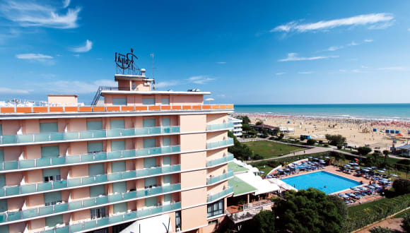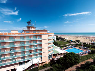 Das Hotel Royal befindet sich direkt am Strand in einer ruhigen Gegend, nahe dem Stadtzentrum von Bibione. Es ist nur wenige Schritte von der Strandpromenade entfernt und bietet Zugang zu einem flach abfallenden Sandstrand, der ideal für Familien ist.