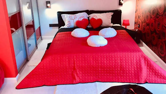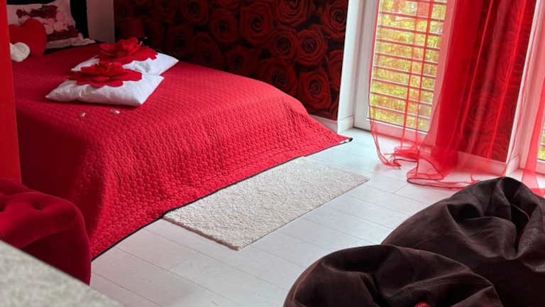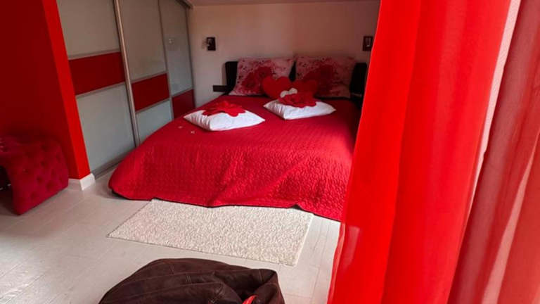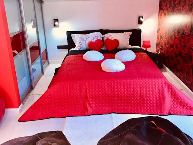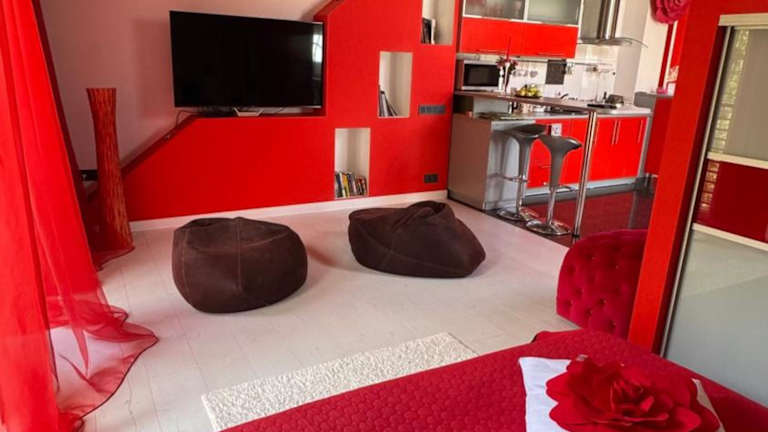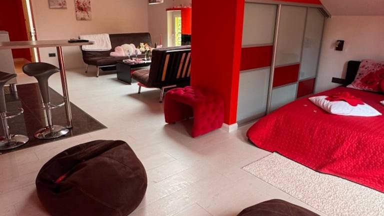 Rožu romantika bietet eine gemütliche Ferienwohnung mit einem Whirlpool und einem Balkon mit Stadtblick. Die Einrichtung umfasst ein Wohnzimmer, ein Schlafzimmer, eine gut ausgestattete Küche sowie ein Badezimmer mit Dusche und Whirlpool. Ein Kinderspielplatz ist ebenfalls vorhanden.