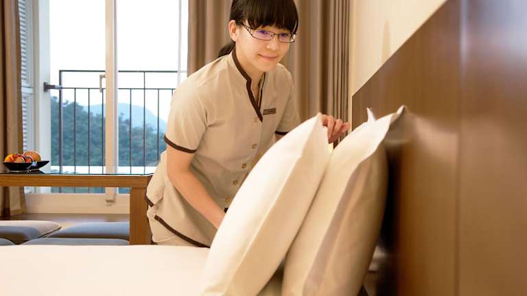 Die Zimmer sind im westlichen oder japanischen Stil eingerichtet und verfügen über raumhohe Fenster, einen 42-Zoll-Flachbild-TV und einen DVD-Player. Das eigene Bad ist mit einer grossen Badewanne mit Warmwasser sowie hochwertigen Pflegeprodukten von Moschino ausgestattet. Teebeutel aus Wedgwood sind ebenfalls im Preis inbegriffen.