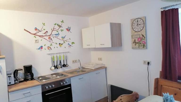 Die Ferienwohnung umfasst zwei Schlafzimmer sowie ein Badezimmer mit Dusche. Zudem ist ein gemütlicher Sitzbereich vorhanden. Die Küche ist mit einem Ofen ausgestattet. In der Unterkunft werden Handtücher und Bettwäsche bereitgestellt.