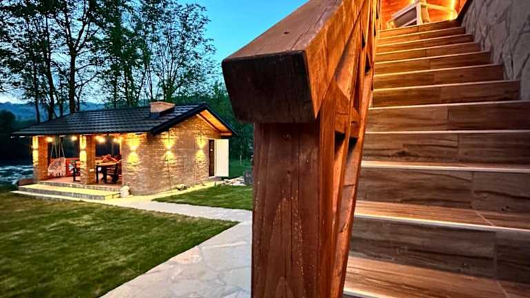 Die Rustic Luxury Villa Drina Drlače befindet sich in Ljubovija direkt am Strand, mit Blick auf die Berge, was eine malerische Umgebung bietet.