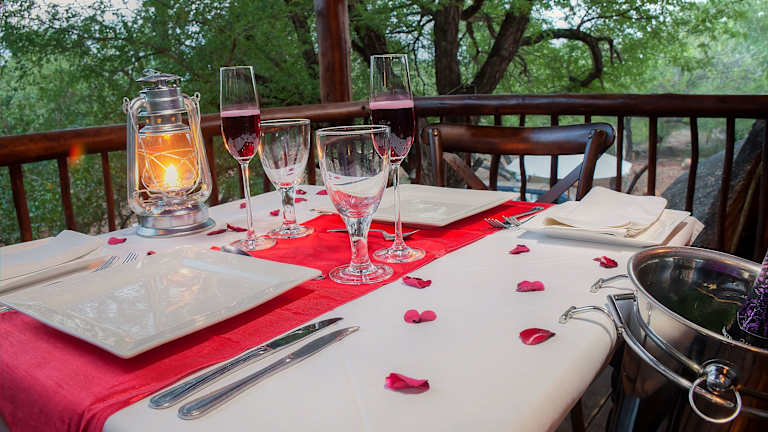 Die Lodge bietet diverse Essbereiche, darunter eine Terrasse, eine Feuerstelle und ein traditionelles Boma. Es wird ein festgelegtes Menü im Restaurant angeboten.