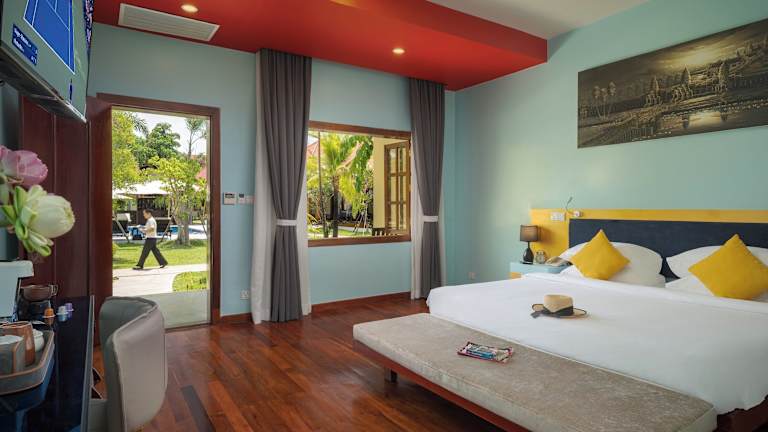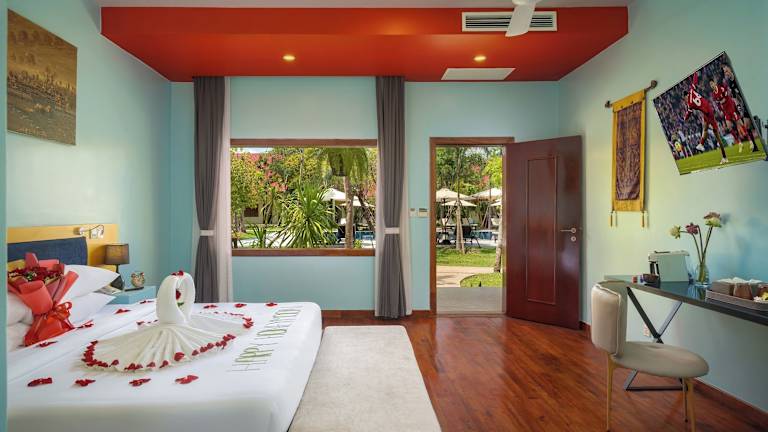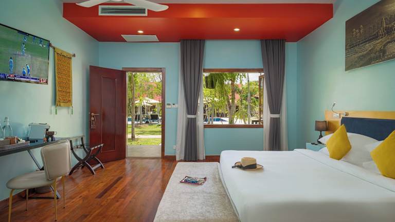 Die klimatisierten Zimmer im Sala Siem Reap Resort sind mit einem Schreibtisch, einer Kaffeemaschine, einem Kühlschrank, einer Minibar, einem Safe, einem Flachbild-TV und einem Balkon ausgestattet. Ein eigenes Badezimmer mit einem Bidet sowie Bettwäsche und Handtücher sind ebenfalls vorhanden.