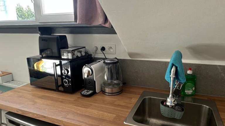 Die Ferienwohnung verfügt über eine Küchenzeile mit Kühlschrank, Mikrowelle und Kaffeemaschine, was eine eigenständige Zubereitung von Mahlzeiten ermöglicht. Weitere gastronomische Angebote sind nicht beschrieben.
