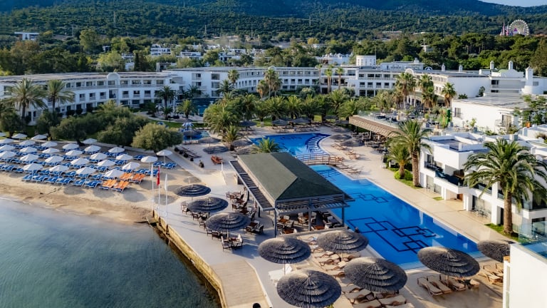 Das Samara Hotel Bodrum bietet eine ideale Lage im Stadtteil Torba von Bodrum. Hier erwarten Sie eine Vielzahl von Annehmlichkeiten wie Innen- und Außenpools, ein Kinderbecken, ein eigener Strandbereich und Wellnesseinrichtungen. Die Unterkünfte sind komfortabel und klimatisiert, mit modernen Möbeln und Balkonen ausgestattet. Das Hotel bietet eine breite Auswahl an Speisen und Getränken, darunter Buffets und À-la-carte-Restaurants, die Meeresfrüchte und türkische Küche servieren. Entspannen Sie am Pool, am Strand oder in der Lobbybar und lassen Sie sich von den Wellnessangeboten verwöhnen. Das Hotel bietet auch Sport- und Freizeitmöglichkeiten wie Tennis, Billard und Tischtennis.