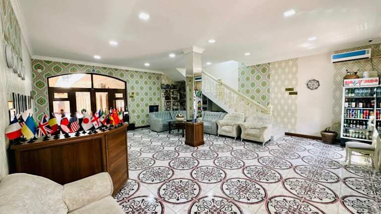 Kleines Hotel mit netten Mitarbeitern und gutem Frühstück, Wenn man Richtung der Minimärkte läuft, gelangt man anschließend auf einem Fußweg, der auf die Hauptstraße zum Registan führt. Dadurch kann der Weg um ca. 1km abgekürzt werden, was die Lage besser werden lässt. Um das Hotel herum gibt es sonst nicht viel. Keine Restaurants oder Supermärkte. Ich habe ein Standard-Doppelzimmer mit Doppelbett und einer Größe von 16qm gebucht. Es war nie und nimmer 16qm groß. Vielleicht 10 bis 12qm. Die Fotos bei booking.com…
