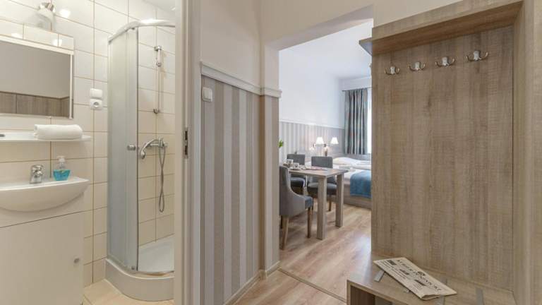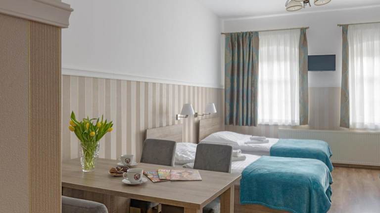 Im Preis des Aufenthalts ist das Frühstück inbegriffen. Auf Wunsch werden Gerichte berücksichtigt, die den speziellen Ernährungsbedürfnissen der Gäste entsprechen. Eine Kaffeestube bietet eine Auswahl an polnischen Speisen.
