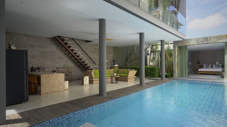 Sandhya Villa Canggu Echo Beach bietet eine angenehme Unterkunft mit einem eigenen Pool, einer Terrasse und einem gut ausgestatteten Badezimmer. Die Villa verfügt über kostenloses Wifi und Parkiermöglichkeiten. Ein Shuttleservice in die Umgebung von Seminyak wird ebenfalls angeboten. Zur Ausstattung gehören ein TV-Raum, ein Garten und ein Fitnessbereich. Es wird ein Zimmerservice angeboten, und die Gäste haben Zugang zu einem Restaurant und einer Bar, die vertraut westliche und indonesische Küche anbieten. Die Unterkunft hat 2012 eröffnet und bietet 6 Zimmer auf insgesamt 2 Etagen.