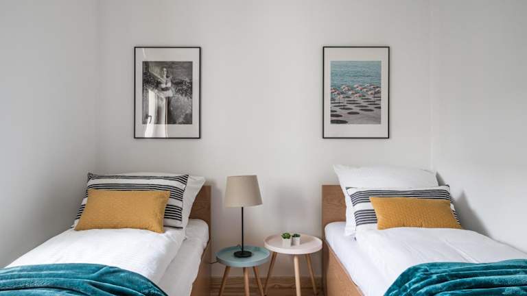Die Ferienwohnung besteht aus zwei Schlafzimmern, einem Wohnzimmer und einer voll ausgestatteten Küchenzeile mit Kühlschrank und Kaffeemaschine. Das Badezimmer ist mit einer Dusche und kostenlosen Pflegeprodukten ausgestattet. Für die Bequemlichkeit der Gäste werden Handtücher und Bettwäsche bereitgestellt.