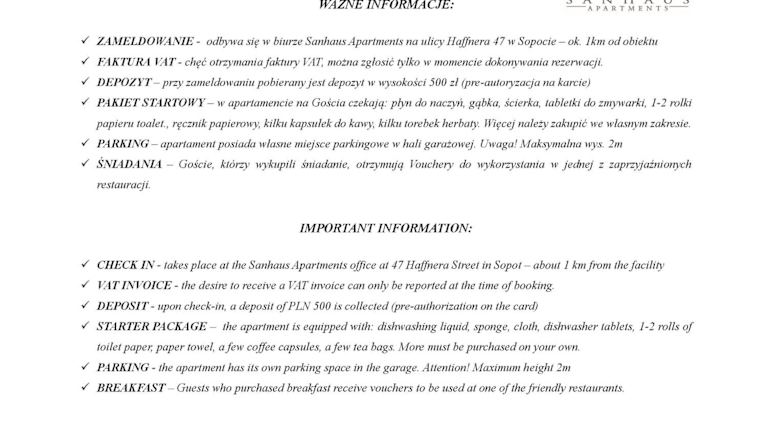 Die Sanhaus Apartments - Apartament Grand ist eine moderne Ferienwohnung mit Balkon und kostenlosem Privatparkplatz. Die Unterkunft bietet eine heimelige Atmosphäre und für Gäste, die Annehmlichkeiten wie Internet und Heizung schätzen, sind diese verfügbar. Es wird darauf hingewiesen, dass Junggesellen-/Junggesellinnenabschiede oder ähnliche Feiern in der Unterkunft nicht erlaubt sind. Der Check-in ist ab 16:00 Uhr möglich und der Check-out muss bis 11:00 Uhr erfolgen.
