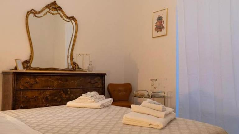Die Ferienwohnung umfasst ein Schlafzimmer, ein Wohnzimmer sowie ein Badezimmer mit Bidet und Dusche. Ein Balkon ergänzt die Ausstattung. Handtücher und Bettwäsche werden bereitgestellt.