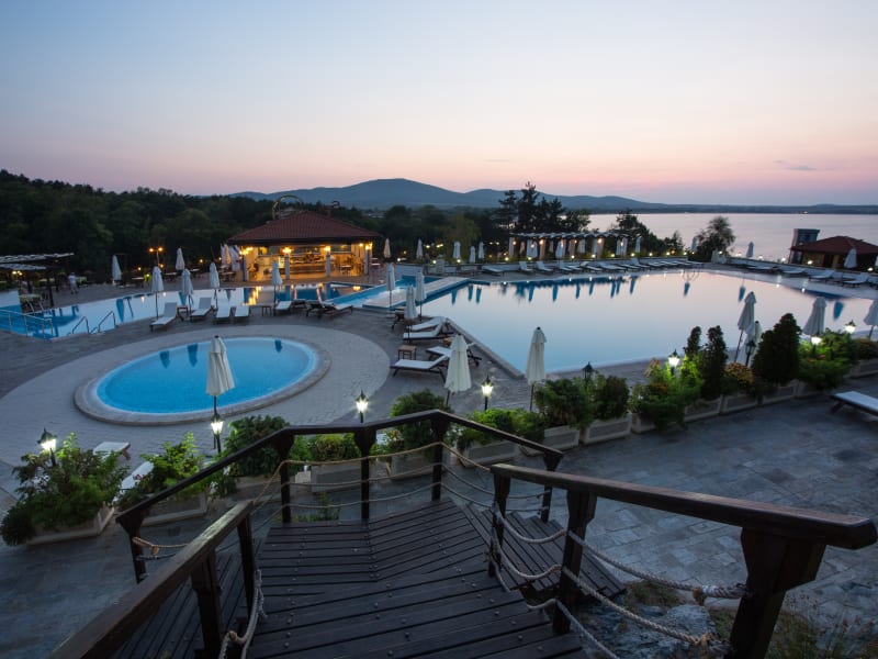 Situated on the Bulgarian Southern coast, Santa Marina Holiday Village is 424 km east from Sofia and just 34 km south of Burgas - the city with one of the largest airports in Bulgaria. Only 2 km north from the old town of Sozopol, Santa Marina has an excellent beach location, offering breathtaking sea views coupled with a variety of green surroundings. The town of Sozopol offers a relaxed lifestyle full of chic restaurants, bars and exciting entertainment. Santa Marina Holiday Village consists of 80 three-storey and four-storey villas with over 1300 apartments of different sizes and provides a wide range of services and entertainment. 70% of the area of Santa Marina (which is approximately 110,000 sq. m) is devoted to gardens, park alleys, parking lots and service facilities. Available to guests is a beach, 5 swimming pools, 5 kid’s pools, solar terraces, 4 theme restaurants, children's playground and animation program in three languages, 2 supermarkets, 3 pool bars, cafés, different shops, 2 wellness centers and hairdresser, medical center, tennis club with 8 courts, football field, laundry and dry cleaning atelier, internal transportation with electric buses, mini-train from / to Sozopol, Smokinya, Kavaci, etc.