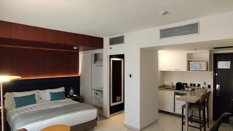 Die Zimmer sind mit Klimaanlage ausgestattet und bieten eine Kochnische mit Kühlschrank, Mikrowelle und Minibar. Zur Ausstattung gehören zudem ein Safe, ein Schreibtisch sowie ein TV-Gerät mit Satelliten- oder Kabelempfang. Das Badezimmer verfügt über eine Dusche und Badewanne sowie einen Haartrockner. Familienzimmer sind für Gäste mit Kindern verfügbar.