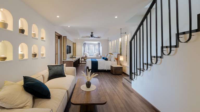 Die Zimmer sind mit Klimaanlage und einem Ventilator ausgestattet und bieten einen Blick auf den Pool von Balkon oder Terrasse. Weiterhin verfügen die Unterkünfte über moderne Annehmlichkeiten wie ein Doppelbett, ein Sofabett, einen Safe, eine Minibar, einen Kühlschrank, eine Tee- und Kaffeemaschine sowie einen TV. Die Badezimmer sind mit Dusche und Badewanne ausgestattet, und rollstuhlgerechte Zimmer stehen ebenfalls zur Verfügung.