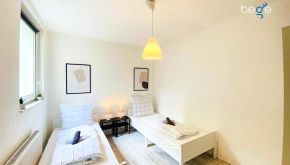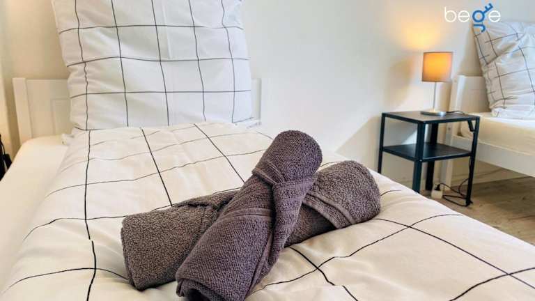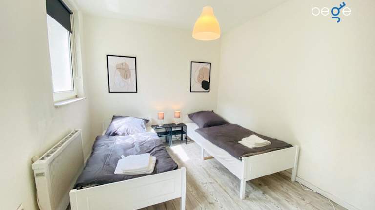 Die Ferienwohnung umfasst 2 Schlafzimmer, ein Badezimmer, einen Essbereich, eine voll ausgestattete Küche sowie einen Balkon mit Stadtblick. Bettwäsche und Handtücher werden gestellt.