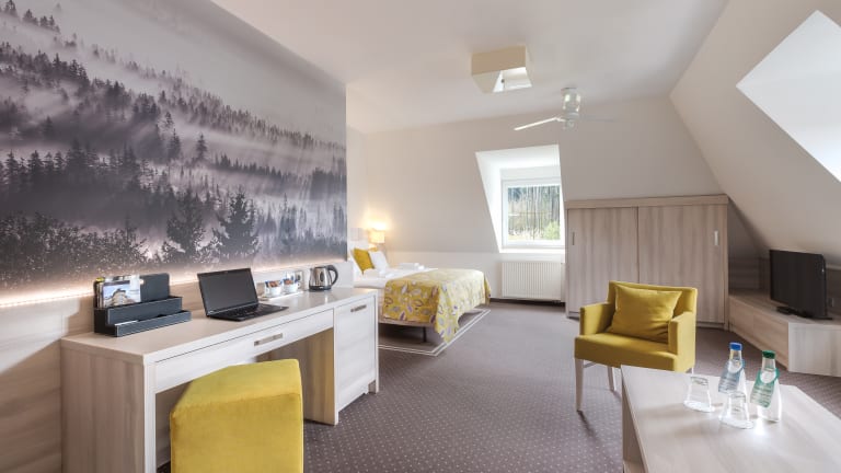Zu einer Übernachtung ist Halbpension buchbar. Für einen entspannten Start in den Urlaubstag sorgt ein Frühstücksbuffet. Italienische und internationale Gerichte können im Restaurant des Hauses nachgefragt werden. Außerdem sind glutenfreie,vegetarische,diabetiker Gerichte bestellbar. Nur einen Steinwurf von der Unterkunft entfernt erwarten Sie mehrere Gaststätten. Besuchen Sie beispielsweise das Restaurant Piekiełko, das Café Sissi und das Restaurant Czeska Zdrojowa.