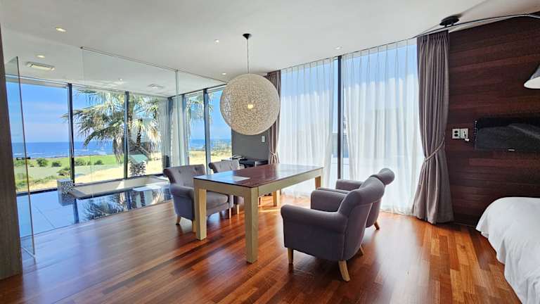 Die Zimmer im Jeju Hotel Scarboro sind modern eingerichtet und bieten allen Komfort, den Sie für einen angenehmen Aufenthalt benötigen. Die Zimmer verfügen über Massivholzböden, einen Kühlschrank, eine Mikrowelle, einen Wasserkocher, einen Essbereich sowie Kaffee- und Teezubehör. Einige Unterkünfte bieten sogar einen eigenen Pool, ein Wohnzimmer und eine Whirlpool-Badewanne. Die geräumigen Sitzbereiche sind mit großen Sofas und einem Flachbild-TV ausgestattet. Im Badezimmer finden Sie Bademäntel, Handtücher, Pflegeprodukte und einen Haartrockner.