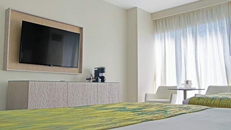 Die Zimmer sind modern gestaltet und verfügen über raumhohe Fenster mit elektrischen Verdunkelungsrollos. Zur Ausstattung gehören ein Kingsize-Bett, ein Safe, eine Minibar sowie ein Flachbild-TV und eine 1-Tassen-Kaffeemaschine. Die Badezimmer sind mit einer Dusche, einer Badewanne und einer Whirlwanne ausgestattet. Rollstuhlgerechte Zimmer mit barrierefreiem Badezimmer sind ebenfalls verfügbar.