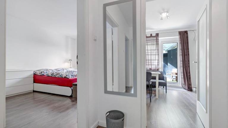 Die Ferienwohnung umfasst ein Schlafzimmer, ein Wohnzimmer sowie eine gut ausgestattete Küche mit Kühlschrank und Geschirrspüler. Des Weiteren bietet sie ein Badezimmer mit Dusche. Handtücher und Bettwäsche werden zur Verfügung gestellt. Die Unterkunft führt strikte Nichtraucherregelungen in allen Bereichen ein.