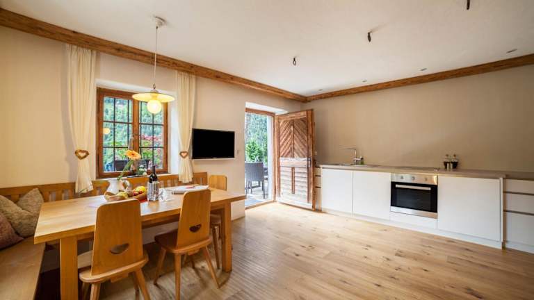 Die Ferienwohnung verfügt über ein Schlafzimmer, ein Wohnzimmer mit TV, eine gut ausgestattete Küche mit Kühlschrank und Geschirrspüler sowie ein Badezimmer mit Dusche. Eine Terrasse mit Bergblick ist ebenfalls verfügbar. Handtücher und Bettwäsche werden bereitgestellt. Auf dem Gelände befindet sich zudem ein Kinderspielplatz.