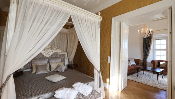 Wenn sich die Pforten der Schloss Schönbrunn Grand Suite öffnen, nimmt der imperiale Charme der Kaiserzeit all ihre Gäste in Empfang. Im imperialen Ambiente können Gäste auf großzügigen 167 m² wie ein Kaiser dinieren und sich wie eine Prinzessin betten. Die exklusive Suite der Austria Trend Hotels ist eine Kombination aus Luxusunterkunft und exklusiver Lage. Sie bietet alles, was das Herz von Royalfans zum Pulsieren bringt. Die Gemächer des ungewöhnlichen Hotelzimmers erstrecken sich über 167 Quadratmeter im Osttrakt der einstigen Sommerresidenz des Kaiserhauses. Es gibt zwei Schlafzimmer, zwei moderne Bäder, einen großzügigen Wohnraum, ein Esszimmer und eine Küche – barock-imperiales Design trifft auf moderne Komforttechnik. Die Ausstattung ist sehr nobel und das Interieur im imperialen Stil und möglichst originalgetreu gehalten, inklusive romantischem Himmelbett und geschmackvollen Stuckarbeiten. Gut zu sehen ist dies auch an der seit den 1830er Jahren am Wiener Hof verbindlich gewordenen Spielart des Neorokoko, die auch als „maria-theresianischer“ Stil bezeichnet wird. Auf dieses harmonische Farbenspiel wurde auch bei der Einrichtung der neuen Suite Bezug genommen: Farblich dominieren Schwarz, Weiß und Gold. Fixer Bestandteil der Suite ist auch der berühmte Hofdamast, ebenfalls bekannt als „Ananasdamast“ – ein traditioneller roter Seidenstoff, benannt nach dem charakteristischen Hauptmotiv einer stilisierten Ananasfrucht, der ausschließlich am Wiener Hof Verwendung fand. Der Master´s Bedroom ist in Weiß- und Goldtönen gehalten und mit einem baldachinüberdachten, mit Schnitzereien verzierten und von einer edlen Gold-Tapezierung mit schimmernden Steinchen umgebenen Himmelbett ausgestattet. Von diesem aus kann man einen direkten Blick auf die Gloriette genießen. Aber auch das zweite Schlafzimmer ist nicht minder luxuriös, wirkt durch sein rot-schwarzes Design jedoch etwas moderner. Es ist mit einem prunkvoll schwarzen Bett mit Goldumrandungen, lederbezogenem Schreibtisch und gold-patinierter Kommode ausgestattet. Ein mit Moire-Tapeten bespannter und reichlich stuckverzierter Flur verbindet die beiden Schlafgemächer. Eine in schwarz und weiß gehaltene Kitchenette bietet eine mit moderner Technik ausgestattete Kochmöglichkeit. Getafelt wird im Salon auf mit Ananasdamast bespannten Stühlen mit traditioneller weißer Lackierung und Goldapplikationen – in Anlehnung an das Schönbrunner Rösselzimmer. In den zwei großzügigen und modernen Luxusbädern lädt eine in schwarzem Klavierlack eingelassene Sitzbadewanne zum Entspannen ein.