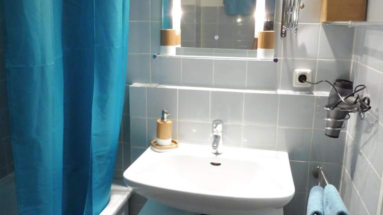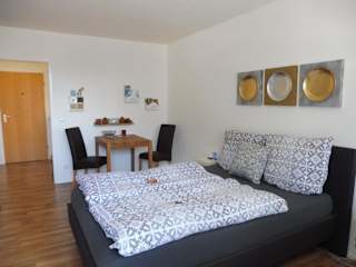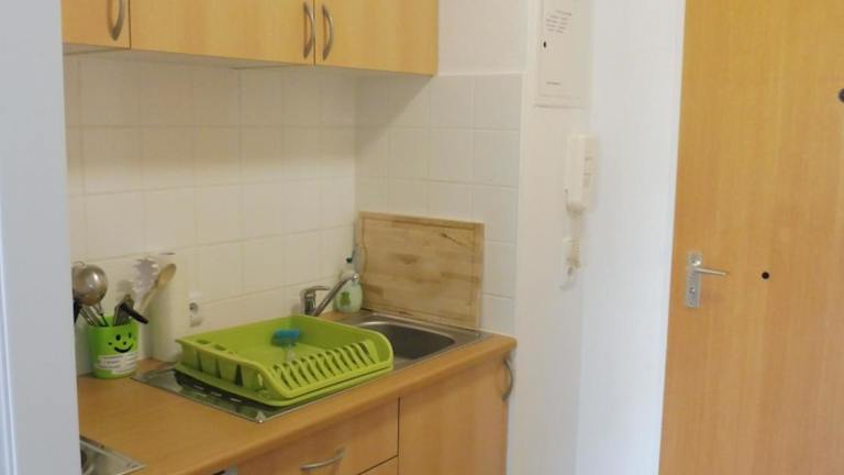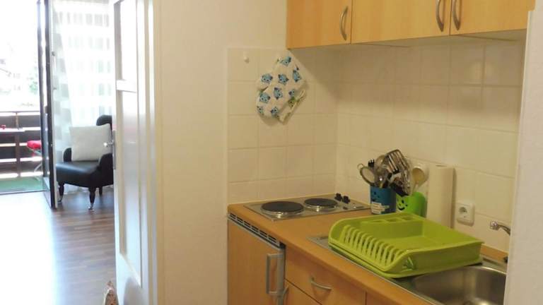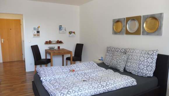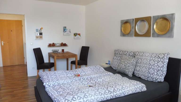 Die Ferienwohnung verfügt über 1 Schlafzimmer und 1 Badezimmer. Zur Ausstattung gehören Bettwäsche, Handtücher, ein Flachbild-TV, ein Essbereich sowie eine voll ausgestattete Küchenzeile. Zudem gibt es einen Balkon mit Blick auf die Stadt.