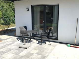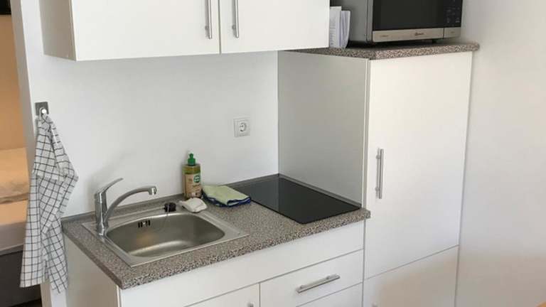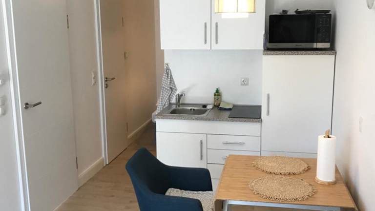 Die Ferienwohnung umfasst eine Küchenzeile, ausgestattet mit einem Ofen und einer Mikrowelle, was eine selbständige Zubereitung von Mahlzeiten ermöglicht. Essen und Trinken können auf der Terrasse genossen werden.