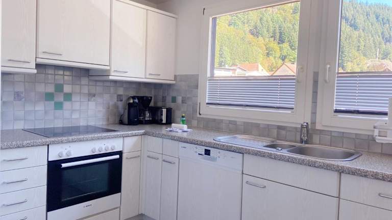 Die Ferienwohnung verfügt über eine voll ausgestattete Küche, die unter anderem einen Kühlschrank, einen Geschirrspüler, eine Waschmaschine, einen Ofen und eine Mikrowelle umfasst. Es werden zudem Handtücher und Bettwäsche bereitgestellt.